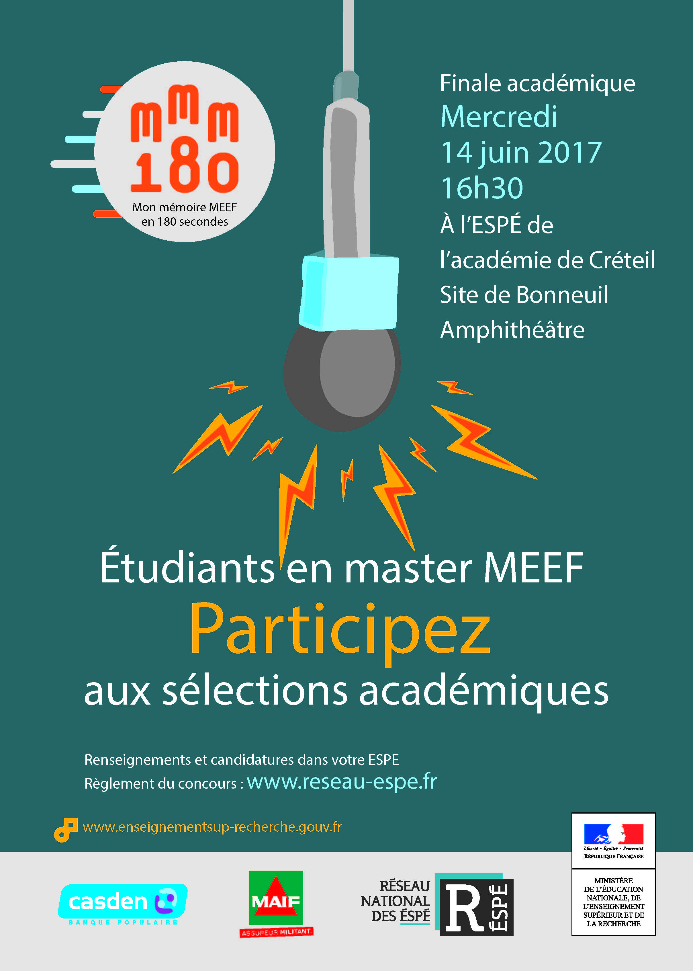 Chaque lauréat sélectionné par son ESPE dans le cadre d’un jury pluri-catégoriel local concourra lors d’une finale nationale qui aura lieu le 28 juin à Paris. Le meilleur exposé de mémoire de Master MEEF en 180 secondes sera récompensé par un jury national à l’issue de la cérémonie. Le lauréat se verra remettre des présents relevant du domaine éducatif par les partenaires du concours (CASDEN, MAIF, MGEN).